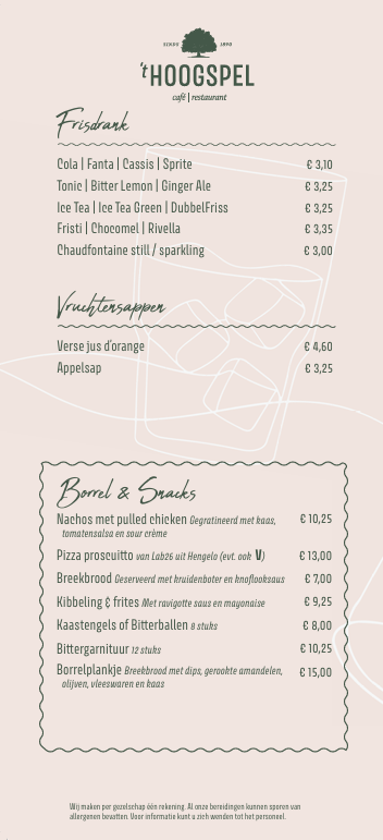 Hieronder vindt u onze drankenkaart, lunchkaart, borrelkaart en een drie gangen keuzediner.